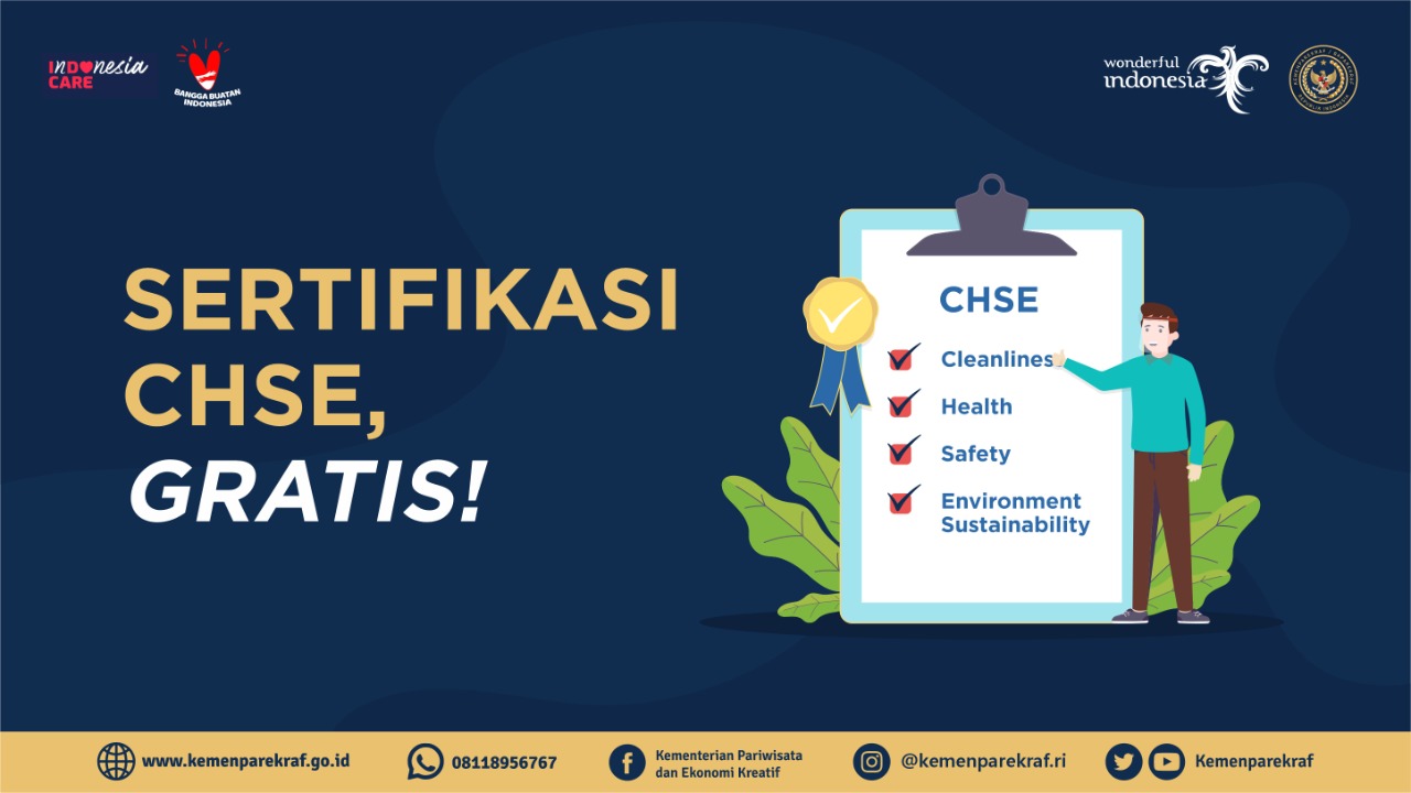 Kemenparekraf serahkan sertifikat chse untuk pelaku usaha pariwisata yogyakarta. Berdasarkan data kementerian pariwisata dan ekonomi kreatif yang diakses minggu (24/10/2021), terdapat sekitar 30 pelaku pariwisata, seperti hotel dan restoran, di kota cirebon yang memiliki sertifikat chse. Sebelumnya, semua pelaku wisata, baik … Prosentasenya belum banyak, baru 25 persen dari pelaku usaha di perhotelan, restauran dan sebagainya," ujar kepala disporapar balikpapan, doortje marpaung, senin (25/10/2021). Sertifikasi chse adalah proses pemberian sertifikat kepada usaha pariwisata, destinasi pariwisata, dan produk pariwisata lainnya untuk memberikan jaminan kepada wisatawan terhadap pelaksanaan kebersihan, kesehatan, keselamatan, dan kelestarian lingkungan.